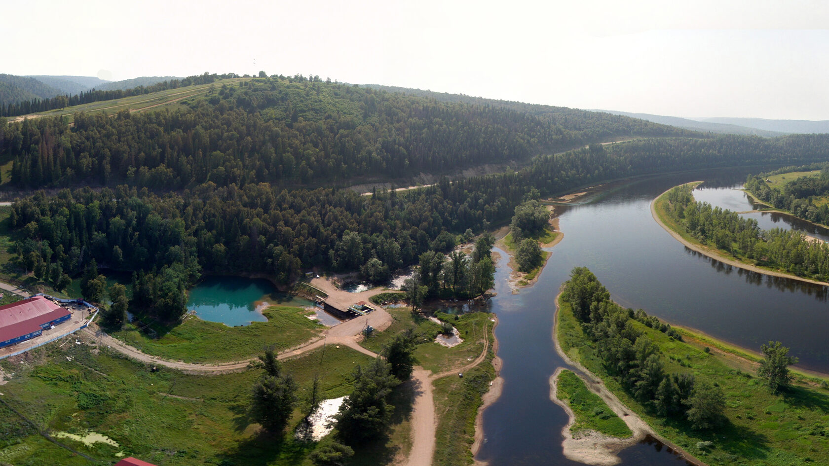 Когда вы подъезжаете к Красному Ключу, картинка складывается из нескольких слоёв сразу. Ниже дороги — низина, где в обрамлении леса лежит яркое озеро-воронка. Над водой стоят мостки и настилы, рядом — небольшая ГЭС и здание завода по розливу воды, который работает здесь с конца 1990-х годов.